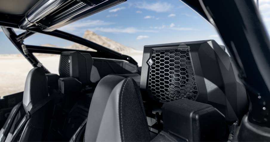 - Ab Werk abgestimmtes und integriertes Rockford Fosgate Stage 4-Audiosystem mit RIDE COMMAND-Headunit. Enthält: (1) 1.500-W-8-Kanal-Digitalverstärker, (2) 100-W-1"-Hochtöner, (2) 100-W-6,5"-Frontlautsprecher (Komponente), (2) 100-W-6,5"-Hecklautsprecher (Koaxial) und (1) 10"-Subwoofer. *Audiosystem IPX7 und IPX9K wassergetestet für extreme Bedingungen.